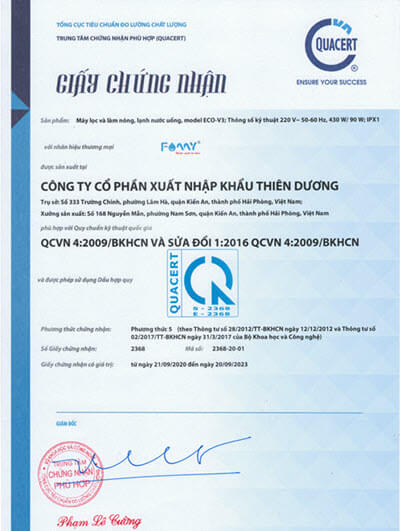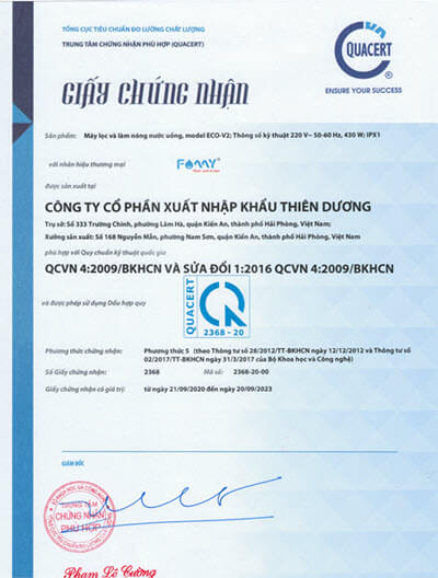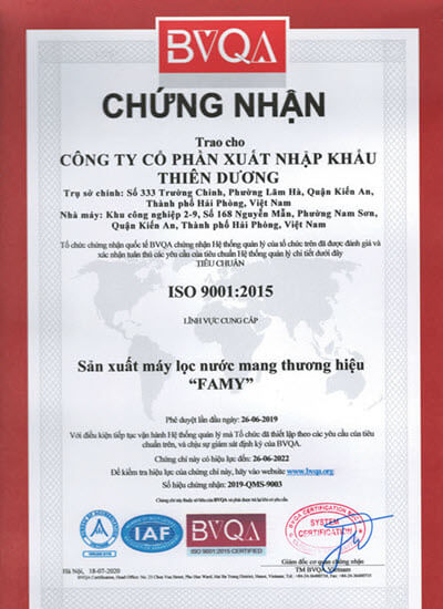 Sản xuất theo ISO 9001:2015, chứng nhận hợp quy QCKT quốc gia QCVN4-2009/BKHCN và QCVN9-2012/BKHCN và tạo ra nguồn nước uống trực tiếp được thử nghiệm theo các tiêu chí đánh giá theo QCKT quốc gia QCVN 6-1:2010/BYT.