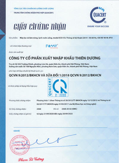• Máy lọc nước Famy được thử nghiệm đáp ứng về tính tương thích và an toàn điện theo Quy chuẩn kỹ thuật quốc gia QCVN 4:2009/BKHCN và QCVN 9:2012/BKHCN của Bộ Khoa học và Công nghệ.